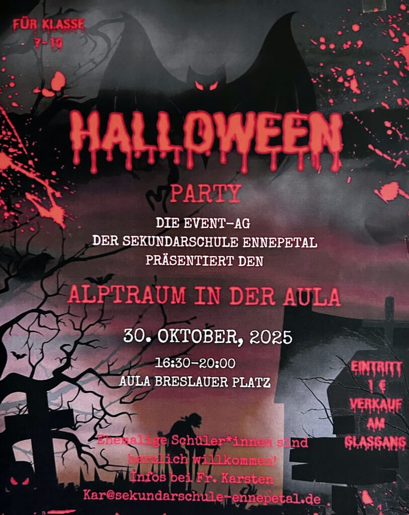 Am gestrigen Donnerstag fand für die Klassen 7-10 unsere mittlerweile traditionelle Halloween-Party am Breslauer Platz statt. Einen ausführlichen Text- und Fotobericht gibt es im nächsten Newsletter – für heute muss das Veranstaltungsplakat genügen.