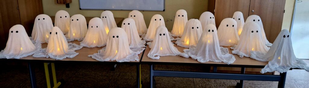 In der letzten Kunststunde waren die SchülerInnen der 6b besonders kreativ. Mit viel Eifer haben sie tolle Geister für Halloween gebastelt. Die gruseligen Kunstwerke sind nicht nur ein echter Hingucker, sondern zeigen auch wie viel Spaß die Kinder beim Basteln hatten.
