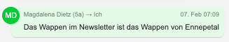 Auch das Quiz dieser Woche beschäftigt sich mit dem Ennepetaler Stadtwappen. Die Frage ist: „Wofür steht die blaue, wellenförmige Linie als zentrales Symbol in dem Wappen?“ Wer die Antwort weiß, schickt sie mir bitte bis kommenden Montag per EduPage. Es werden von mir nur rechtschreibfehlerfreie Antworten beachtet!
